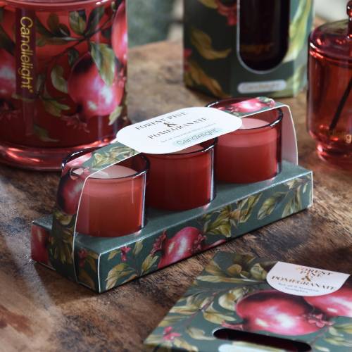 This elegant trio of red glass candles captures the freshness of pine and the rich sweetness of pomegranate, bringing a warm seasonal fragrance into your home. Each candle blends woodland notes with fruity depth to create a comforting, festive atmosphere.
