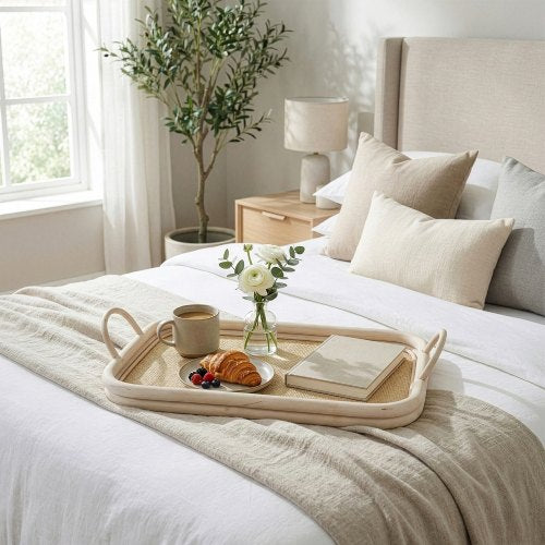 Its shallow form and natural weave make it ideal for presenting drinks, displaying candles, or tidying a coffee table. The warm tone suits a variety of decor styles, from bohemian to modern country.