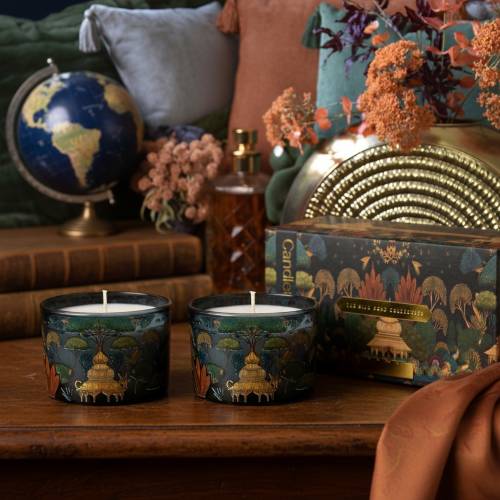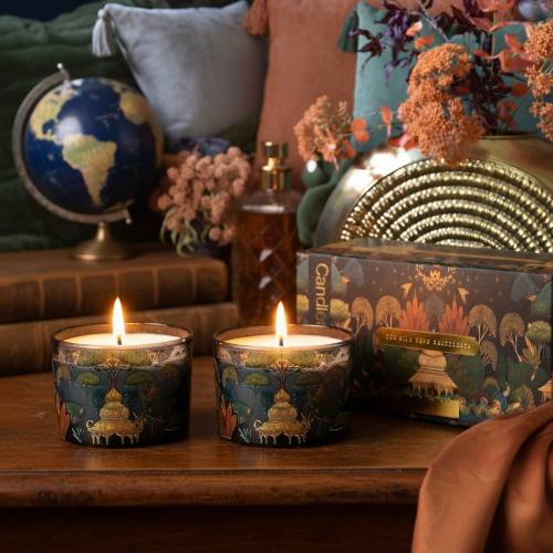 Add elegance and fragrance to your home with the Jaisalmer Kashmir Pear & Fig Candle Duo from the Silk Road Collection. Presented in decorative glass holders with golden domed motifs and lush botanical detailing, this set draws inspiration from the artistry and grandeur of Jaisalmer.