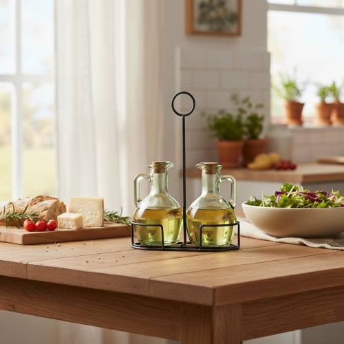 Add a rustic yet refined touch to your kitchen with this Set of 2 Green Oil Bottles. Crafted from green-tinted glass with natural cork stoppers, they combine practicality with charm. Perfect for storing and pouring olive oil, vinegar, or dressings, these bottles make both cooking and serving more stylish. Their timeless design also makes them an attractive addition to open shelving or dining table displays.