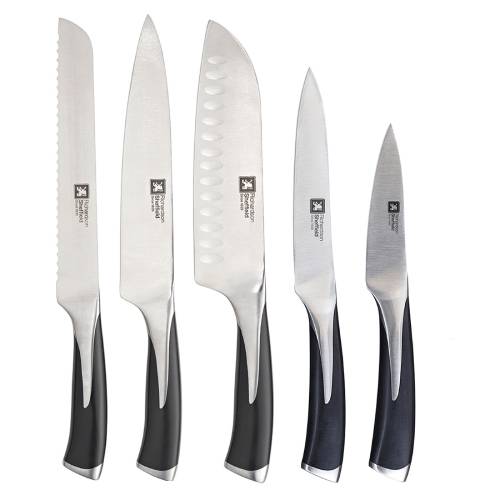 - Pieces: 5 (chef’s knife, bread knife, carving knife, utility knife, paring knife)