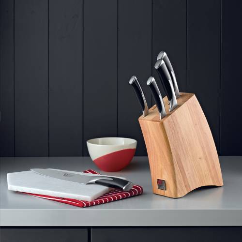 The sleek handles provide comfort and control, while the natural wooden block keeps your knives organised and within easy reach. This set is ideal for everyday cooking and provides an elegant display for kitchen worktops.