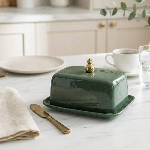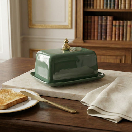 - Sage green butter dish finished with a decorative gold pineapple knob