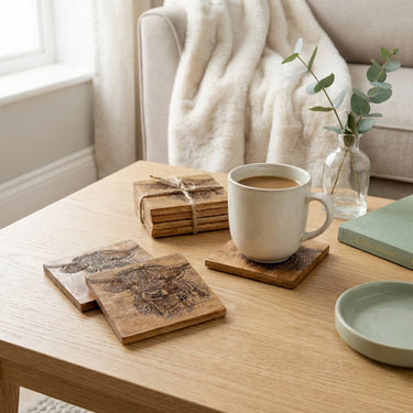 Protect your surfaces in style with these highland cow coasters, a rustic set of four designed to bring warmth and character to your coffee table or dining space. Made with an earthy wooden finish and detailed Highland cow artwork, they add a cosy countryside feel to everyday drinks, from morning brews to evening tipples.