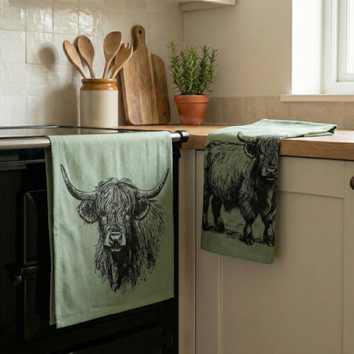 Sage Green Highland Cow Tea Towels