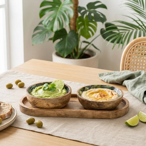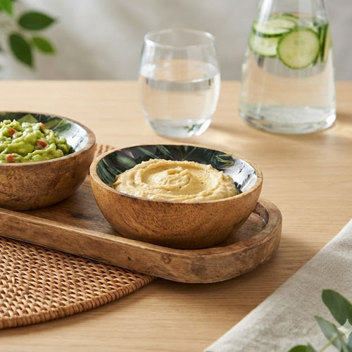 Serve in style with this set of two mango wood dipping bowls, neatly arranged on a matching tray. Ideal for snacks, sauces or shared appetisers, this rustic set adds charm to casual dining and entertaining alike.