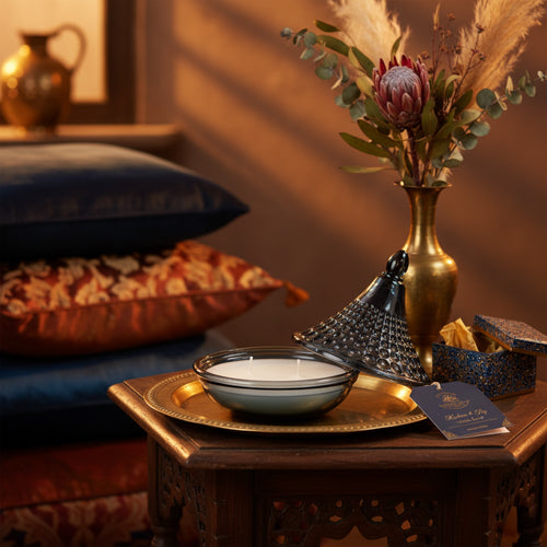 Bring elegance and fragrance into your home with the Luxury Kashmir Pear & Fig Candle in Blue Glass Holder. Encased in a beautifully crafted blue glass vessel with a matching textured lid, this candle is as decorative as it is indulgent.