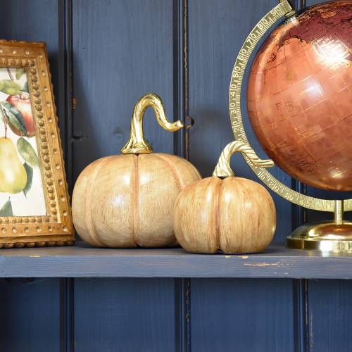 Bring natural warmth to your interiors with the Small Decorative Wooden Pumpkin. Crafted from smooth mango wood and finished with a gold-toned stem, this ornament blends rustic charm with understated elegance.