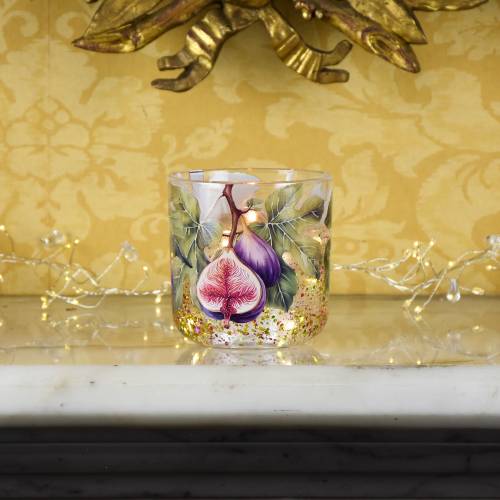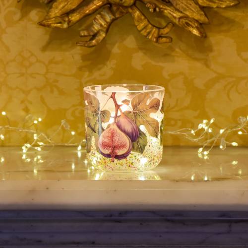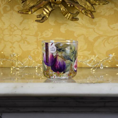 Enjoy a warm glow with the Wild Fig & Saffron LED Glitter Candle. Set in a decorative glass holder with fig and leaf detailing, it features a gel centre infused with glitter and LEDs that shimmer with a flame-like effect.