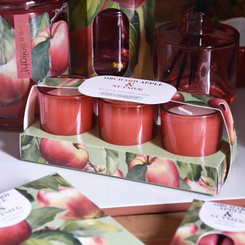 This elegant trio of red glass candles brings the warmth and comfort of autumn into your home. Each candle is infused with the inviting fragrance of crisp orchard apple and warming nutmeg, creating a cosy seasonal atmosphere.