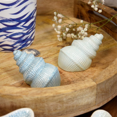 Inspired by the coast, this set of shell-shaped salt and pepper pots brings a subtle nautical touch to your table. Each piece is finished with a reactive glaze, creating soft colour variations that make every set unique.