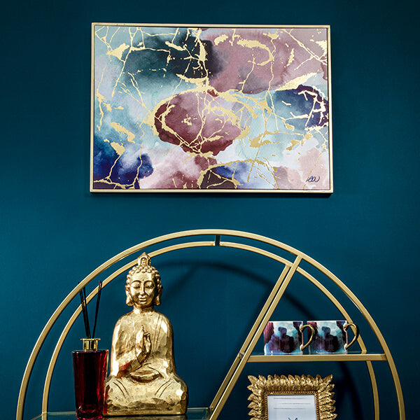 The golden frame encompasses the artwork, as the divine encases everything that is good. The gentleness of the running watercolour will slip seamlessly into a range of interior aesthetics, and the vividness of the gold detailing will embolden any surrounding colours. Life imitates art, thus let this artwork lift your life.
