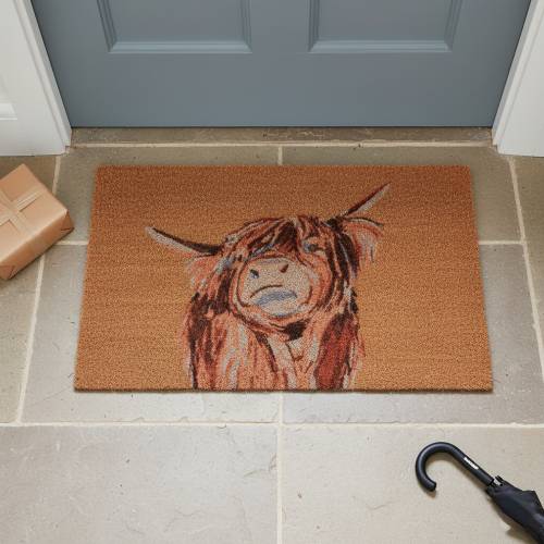 Welcome guests with a touch of character. This hardwearing doormat features a bold Highland cow motif on a warm, natural-toned ground, adding charm to any doorway. The tough, dirt-scraping surface helps trap mud at the threshold, while a low profile keeps door movement smooth. Easy to shake or vacuum clean, it is designed for everyday use in busy homes.