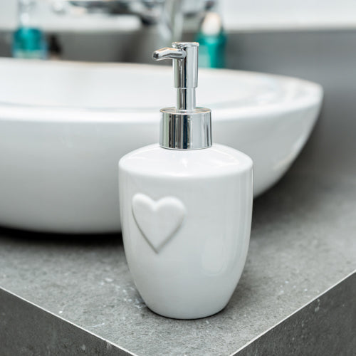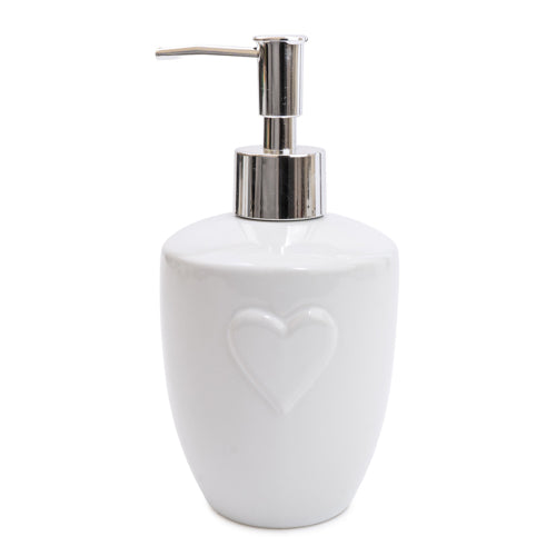 Give your bathroom a subtle lift with this white ceramic lotion dispenser, finished with a sweet embossed heart. The smooth glaze and sleek chrome pump deliver easy, mess-free dispensing—perfect for liquid soap or lotion—while the sturdy ceramic build is made to last. A simple, elegant touch for any sink or vanity.