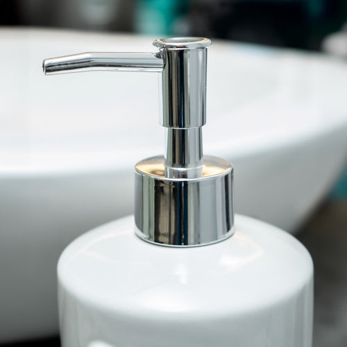 • Durable & Practical: Solid ceramic body paired with a smooth chrome pump.