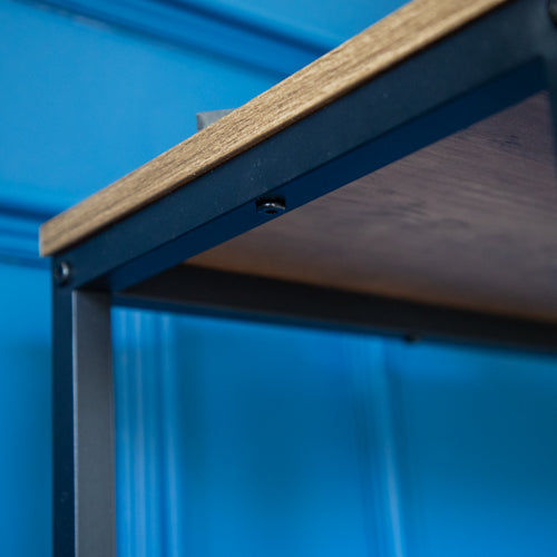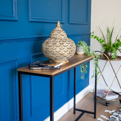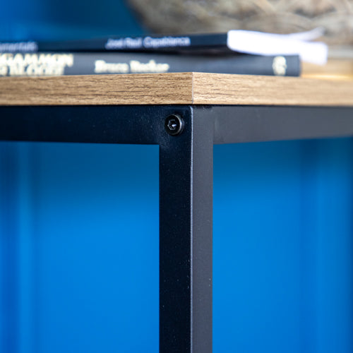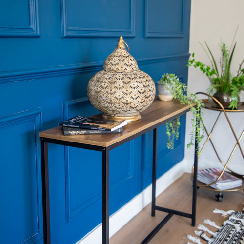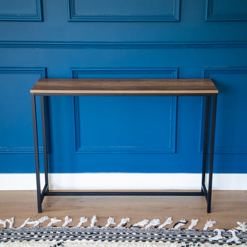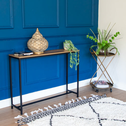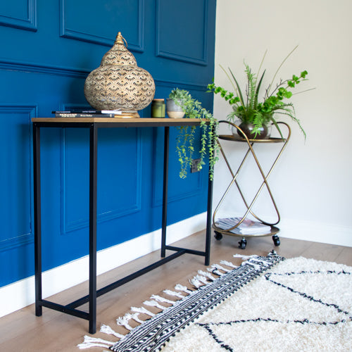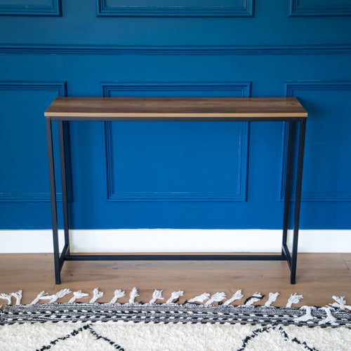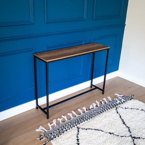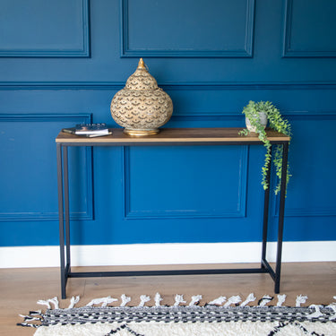 Its compact size makes it ideal for smaller spaces, while its timeless appeal ensures lasting enjoyment. Elevate your home decor with the understated elegance of our black metal console table in yellow oak, and create a welcoming atmosphere that reflects your unique style and personality.