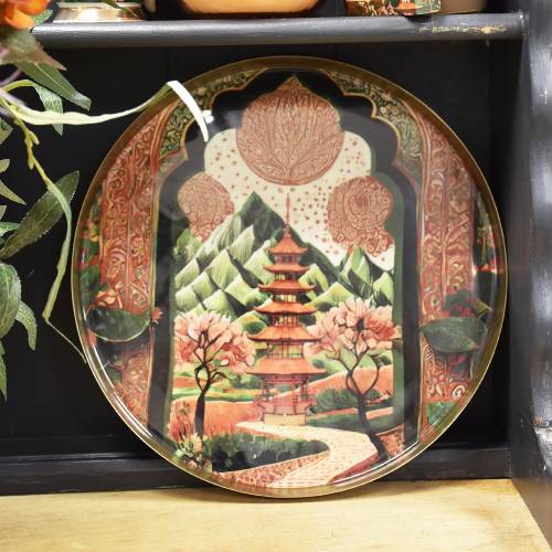 Elevate your home décor with the Samarkand Decorative Tray from the Silk Road Collection. Featuring an intricate pagoda and blossom design set against a rich, vibrant backdrop of mountains and ornate Eastern patterns, this tray captures the spirit of cultural elegance and artistry.