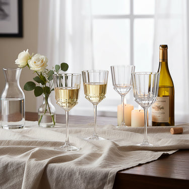 Enjoy your favourite wines in style with this set of four Maccassar Small Wine Glasses. Each glass holds 27 centilitres, the perfect medium size for red, white, or rosé. Designed with a faceted pressed glass bowl and stem, they bring a touch of elegance to both everyday dining and special occasions. These glasses are dishwasher safe, making them both practical and stylish. Presented in a window gift box, this set also makes a thoughtful gift for weddings, anniversaries, or housewarmings.