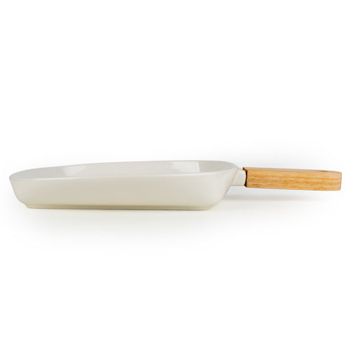 - Ceramic surface with a natural wooden handle for easy serving